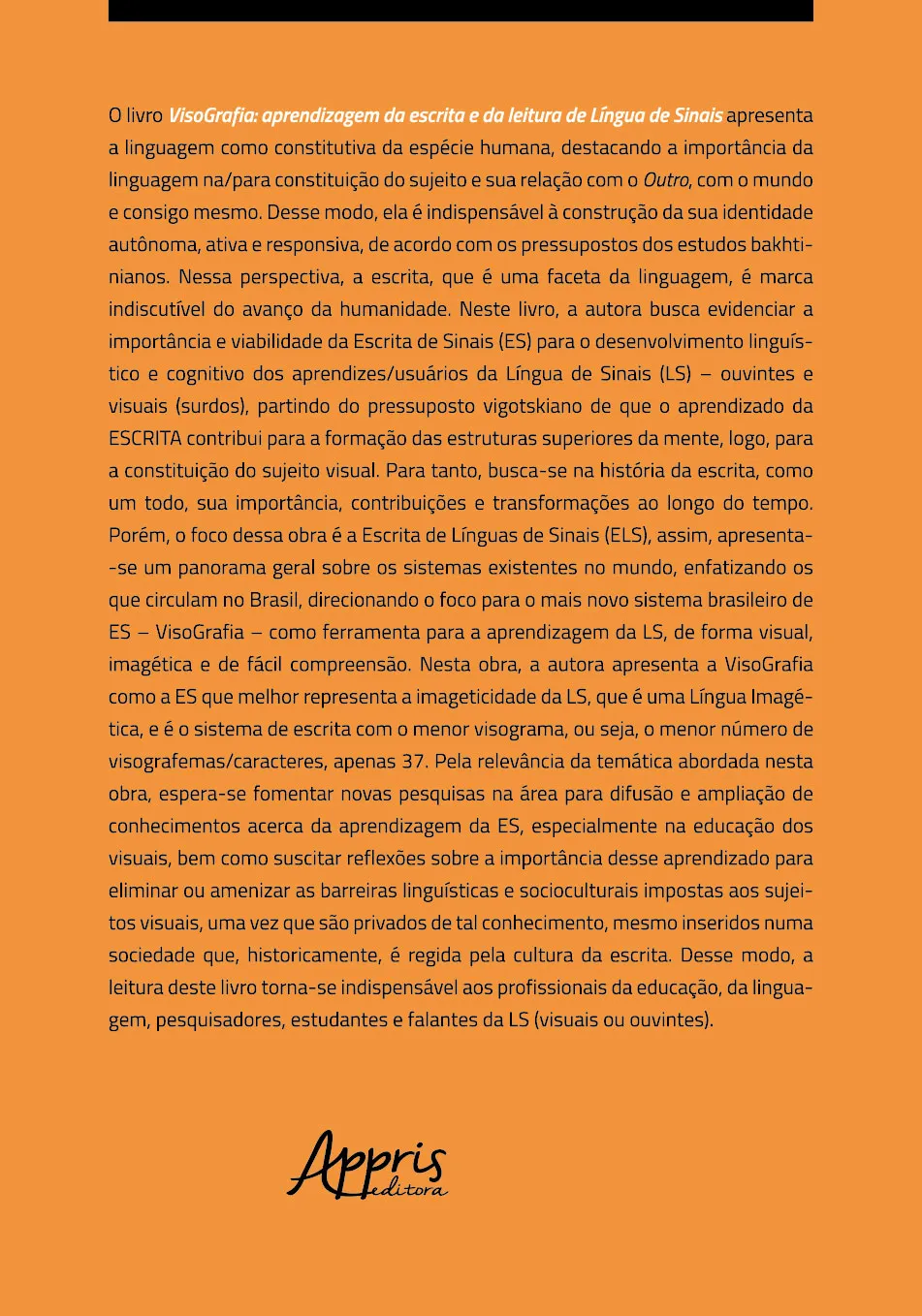 O livro VisoGrafia: aprendizagem da escrita e da leitura de Língua de Sinais apresenta a linguagem como constitutiva da espécie humana, destacando a importância da linguagem na/para constituição do sujeito e sua relação com o Outro, com o mundo e consigo mesmo. Desse modo, ela é indispensável à construção da sua identidade autônoma, ativa e responsiva, de acordo com os pressupostos dos estudos bakhtinianos. Nessa perspectiva, a escrita, que é uma faceta da linguagem, é marca indiscutível do avanço da humanidade. Neste livro, a autora busca evidenciar a importância e viabilidade da Escrita de Sinais (ES) para o desenvolvimento linguístico e cognitivo dos aprendizes/usuários da Língua de Sinais (LS) – ouvintes e visuais (surdos), partindo do pressuposto vigotskiano de que o aprendizado da ESCRITA contribui para a formação das estruturas superiores da mente, logo, para a constituição do sujeito visual. Para tanto, busca-se na história da escrita, como um todo, sua importância, contribuições e transformações ao longo do tempo. Porém, o foco dessa obra é a Escrita de Línguas de Sinais (ELS), assim, apresenta-se um panorama geral sobre os sistemas existentes no mundo, enfatizando os que circulam no Brasil, direcionando o foco para o mais novo sistema brasileiro de ES – VisoGrafia – como ferramenta para a aprendizagem da LS, de forma visual, imagética e de fácil compreensão. Nesta obra, a autora apresenta a VisoGrafia como a ES que melhor representa a imageticidade da LS, que é uma Língua Imagética, e é o sistema de escrita com o menor visograma, ou seja, o menor número de visografemas/caracteres, apenas 37. Pela relevância da temática abordada nesta obra, espera-se fomentar novas pesquisas na área para difusão e ampliação de conhecimentos acerca da aprendizagem da ES, especialmente na educação dos visuais, bem como suscitar reflexões sobre a importância desse aprendizado para