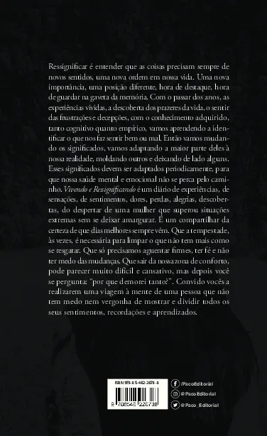 Ressignificar é entender que as coisas precisam sempre de novos sentidos, uma nova ordem em nossa vida. Uma nova importância, uma posição diferente, hora de destaque, hora de guardar na gaveta da memória. Com o passar dos anos, as experiências vividas, a descoberta dos prazeres da vida, o sentir das frustrações e decepções, com o conhecimento adquirido, tanto cognitivo quanto empírico, vamos aprendendo a identificar o que nos faz sentir bem ou mal. Então vamos mudando os significados, vamos adaptando a maior parte deles à nossa realidade, moldando outros e deixando de lado alguns. Esses significados devem ser adaptados periodicamente, para que nossa saúde mental e emocional não se perca pelo caminho. “Vivendo e Ressignificando” é um diário de experiências, de sensações, de sentimentos, dores, perdas, alegrias, descobertas, do despertar de uma mulher que superou situações extremas sem se deixar amargurar. É um compartilhar da certeza de que dias melhores sempre vêm. Que a tempestade, às vezes, é necessária para limpar o que não tem mais como se resgatar. Que só precisamos aguentar firmes, ter fé e não ter medo das mudanças. Que sair da nossa zona de conforto, pode parecer muito difícil e cansativo, mas depois você se pergunta, “por que demorei tanto?” Convido vocês a realizarem uma viagem à mente de uma pessoa que não tem medo nem vergonha de mostrar e dividir todos os seus sentimentos, recordações e aprendizados.