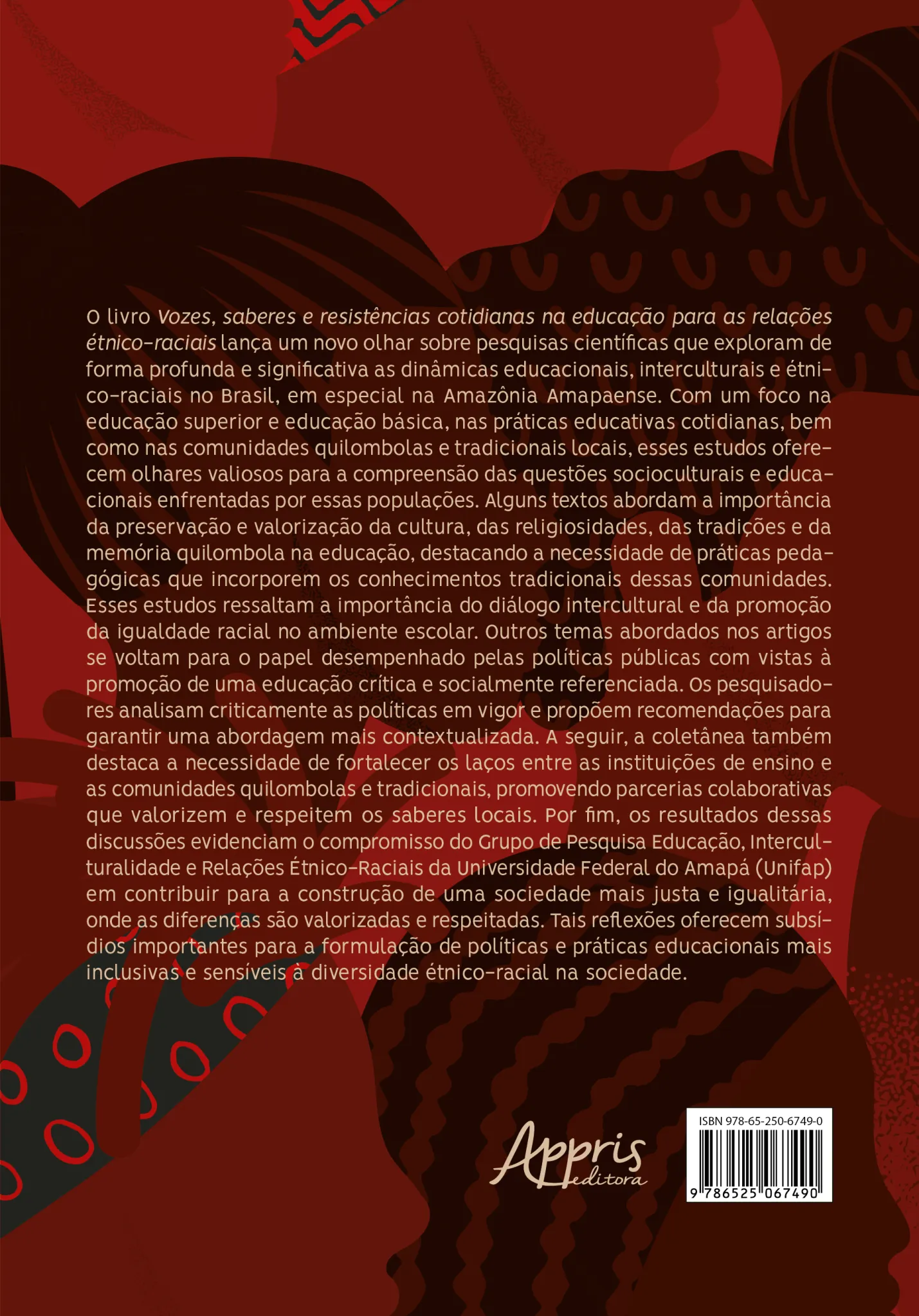 O livro Vozes, saberes e resistências cotidianas na educação para as relações étnico-raciais lança um novo olhar sobre pesquisas científicas que exploram de forma profunda e significativa as dinâmicas educacionais, interculturais e étnico-raciais no Brasil, em especial na Amazônia Amapaense. Com um foco na educação superior e educação básica, nas práticas educativas cotidianas, bem como nas comunidades quilombolas e tradicionais locais, esses estudos oferecem olhares valiosos para a compreensão das questões socioculturais e educacionais enfrentadas por essas populações. Alguns textos abordam a importância da preservação e valorização da cultura, das religiosidades, das tradições e da memória quilombola na educação, destacando a necessidade de práticas pedagógicas que incorporem os conhecimentos tradicionais dessas comunidades. Esses estudos ressaltam a importância do diálogo intercultural e da promoção da igualdade racial no ambiente escolar. Outros temas abordados nos artigos se voltam para o papel desempenhado pelas políticas públicas com vistas à promoção de uma educação crítica e socialmente referenciada. Os pesquisadores analisam criticamente as políticas em vigor e propõem recomendações para garantir uma abordagem mais contextualizada. A seguir, a coletânea também destaca a necessidade de fortalecer os laços entre as instituições de ensino e as comunidades quilombolas e tradicionais, promovendo parcerias colaborativas que valorizem e respeitem os saberes locais. Por fim, os resultados dessas discussões evidenciam o compromisso do Grupo de Pesquisa Educação, Interculturalidade e Relações Étnico-Raciais da Universidade Federal do Amapá (Unifap) em contribuir para a construção de uma sociedade mais justa e igualitária, onde as diferenças são valorizadas e respeitadas. Tais reflexões oferecem subsídios importantes para a formulação de políticas e práticas educacionais mais inclusivas e sensíveis à diversidade étnico-racial na sociedade.