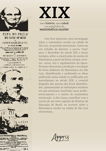 Este livro apresenta uma investigação sobre a matemática escolar na cidade de São Luís, no período oitocentista. Como em um trabalho de detetive, a autora “viaja” para o Maranhão do século XIX e busca vestígios sobre a constituição do ensino de Matemática a partir de livros, jornais, revistas, cartas, leis e regulamentos da época. Portanto descortina a produção e circulação de livros didáticos de Matemática em São Luís, identificando e analisando as obras publicadas nessa cidade ou publicadas por maranhenses no século XIX, e constrói biografia dos autores dos livros identificados, apresentando as instituições escolares em que estiveram envolvidos esses professores/autores e o ensino de matemática ministrado. A obra busca contribuir com a escrita de um novo capítulo da História da Educação do Brasil, ao escrever sobre a Matemática escolar na cidade de São Luís oitocentista.